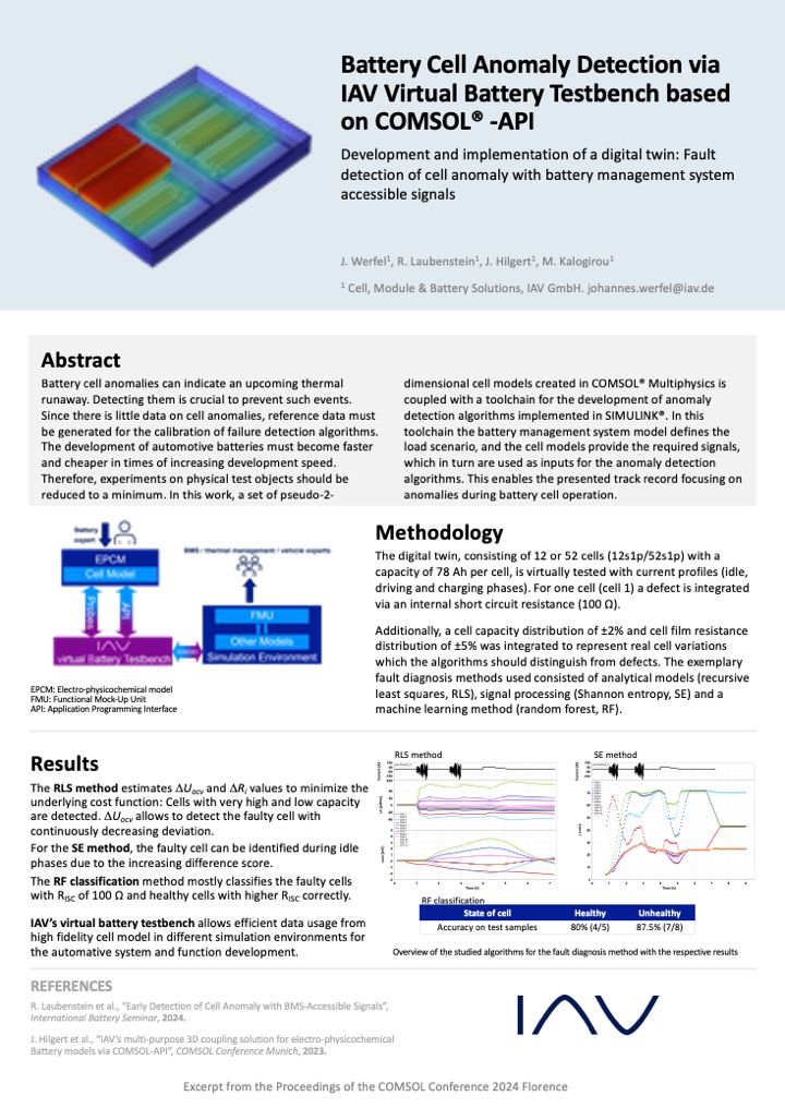 A poster from the COMSOL Conference 2024 Florence that details how researchers used COMSOL Multiphysics to develop an app for battery cell anomaly detection.