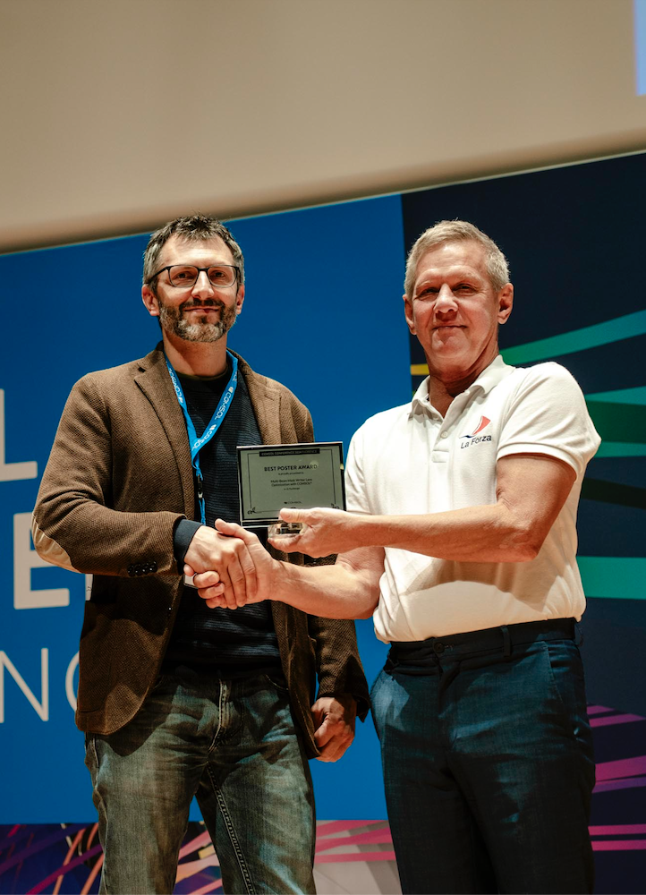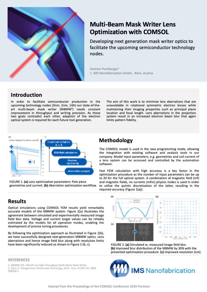 The second Best Poster award went to Dietmar Puchberger for his work on optimizing next-generation multibeam mask writer (MBMW) systems. As showcased by his poster, Puchberger is using optical simulation to minimize lens aberrations and thus image field blur while maintaining the imaging properties of the lens. The results show a 30% reduction in image field blur.