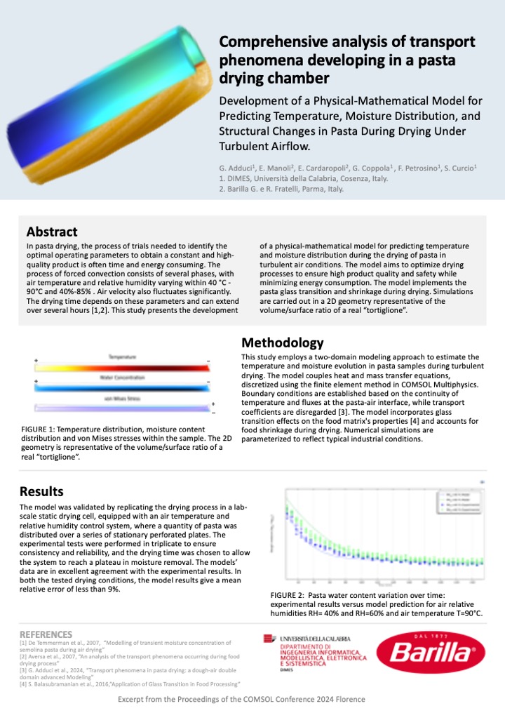 The first Best Poster award was presented to Gaetano Adduci, Gerardo Coppola, Francesco Petrosino, S. Curcio, Eleonora Manoli, and Emily Cardaropoli for their poster on using simulation to optimize the pasta-drying process. The goal of the project was to create a high-quality, safe food product while minimizing energy consumption. To do this, the team created a model that evaluates the temperature, moisture distribution, and structural changes in pasta during turbulent drying.